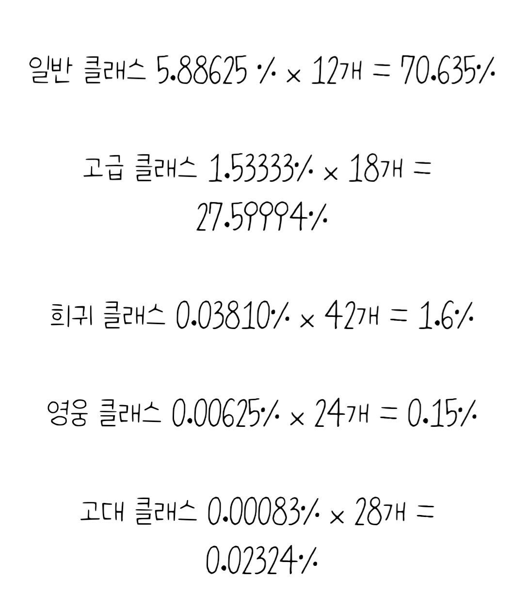 다른 리니지류 들도 위 확율이랑 비슷합니다. 결코 높은 확율이 아니니 무턱대고 몇십만원 충전해서 뽑으려는 시도를 신중하시기 바랍니다.