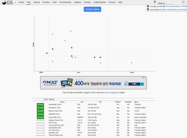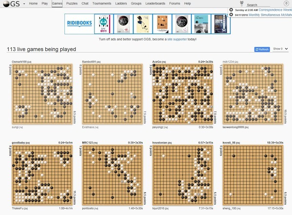 이 사이트에서는 다른 사람들이 두는 바둑도 관전할 수 있습니다. 진행 상황이 한눈에 보이도록 잘 구성되어 있어서 편리하게 관전할 수 있습니다. 비록 모든 내용이 영어로 되어 있어 조금 불편할 수 있지만, 사용된 언어가 어렵지 않아 쉽게 이해하고 사용할 수 있습니다.